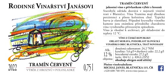Starobylá odrůda dozrává v nejstarší viniční trati v Blatničce. Vína Tramínu mají dlouhou perzistenci a plnou kořenitou chuť. Typická barva je zlatožlutá.